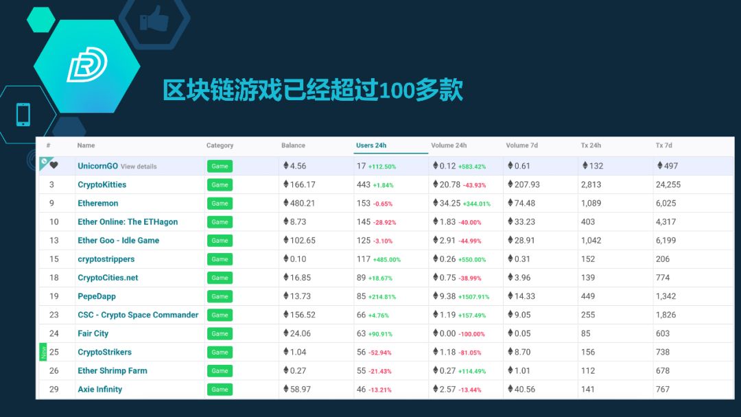 现在在区块链的游戏领域,已经有超过100款应用。但是你们能够看得到,从日活来看,第一名是四百多个人。