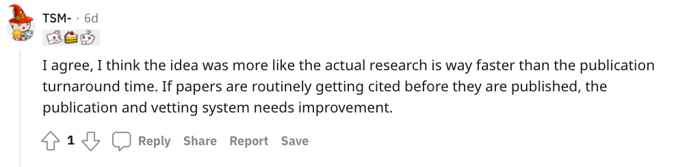 原博主认同「引用数和论文质量不挂钩」,他想强调的是「实际研究进展是比论文发表要快的,所以出版和审查系统需要改进,不能总是让论文在发表前被引用这种事发生」。