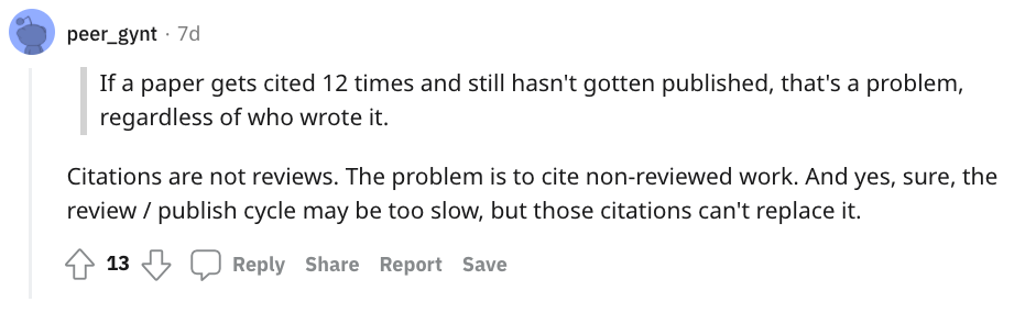 下方的回答也指出了「引用未审阅的工作是真正的问题」,但仍然坚持「尽管审阅发表的流程是挺慢的,但是审阅的过程是无可替代的」。