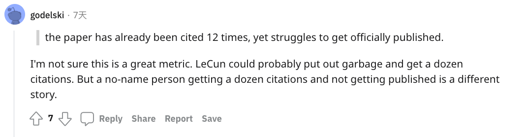 「LeCun可能产出垃圾文章但是收获一堆引用,如果一个无名小卒的论文得到了很多引用,却没有发表机会,这就完全是另一码事了。」