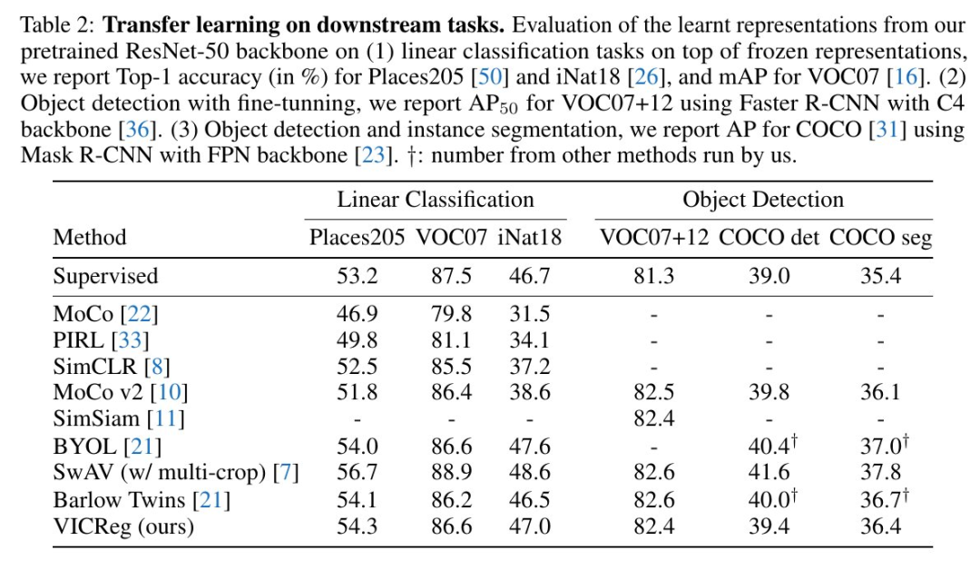 VICReg使用线性分类器头在ImageNet上,在低数据状态下的半监督ImageNet上,还有在下游任务的迁移学习上,都取得了有竞争力的结果。