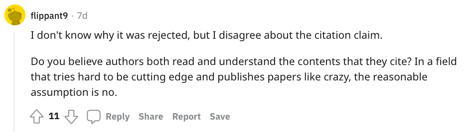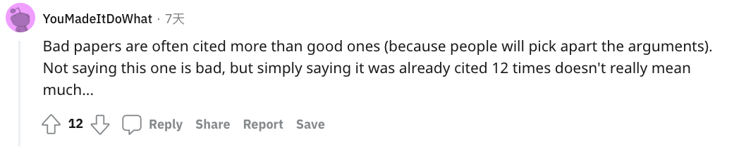 针对引用次数是否能代表论文质量这一问题,Reddit的网友也展开了激烈的讨论,有博主认为「一篇文章已经被引用了12次,然而在得到官方发表的时候还是十分艰难,这说明传统的会议和发表流程周期实在太长了,这个非常值得关注的问题」。
