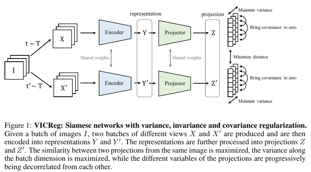 VICReg是一种非常简单有效的联合嵌入体系结构(Joint-Embedding Architectures,JEA)自监督训练图像表征学习方法,它将问题分解为三个不同的原则:用不变项学习对不同视图的不变性,用方差正则项避免表征的崩溃,用协方差正则项将信息分散到表征的不同维度。