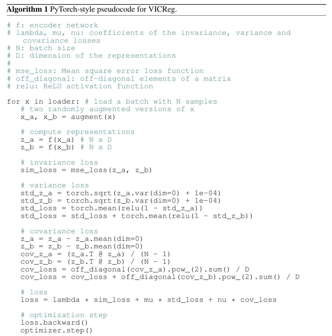 采用简单的方差铰链损失,很好地控制模型训练时的崩溃(见PyTorch伪代码)