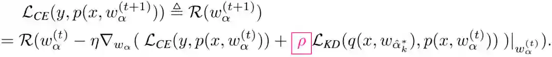 知识蒸馏是一种被广泛应用的模型压缩方法,通过让小型网络来模仿预训练大型网络的最后一层输出特征,可以使小型网络达到接近于大型网络的表现。研究员们通过优先路径来进行蒸馏,从而无需提前训练一个大型神经网络。对超网进行更新的具体公式如下: