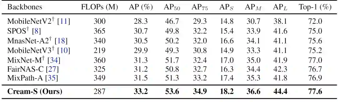 表2:基于优先路径蒸馏的网络结构搜索模型在物体检测任务上的表现