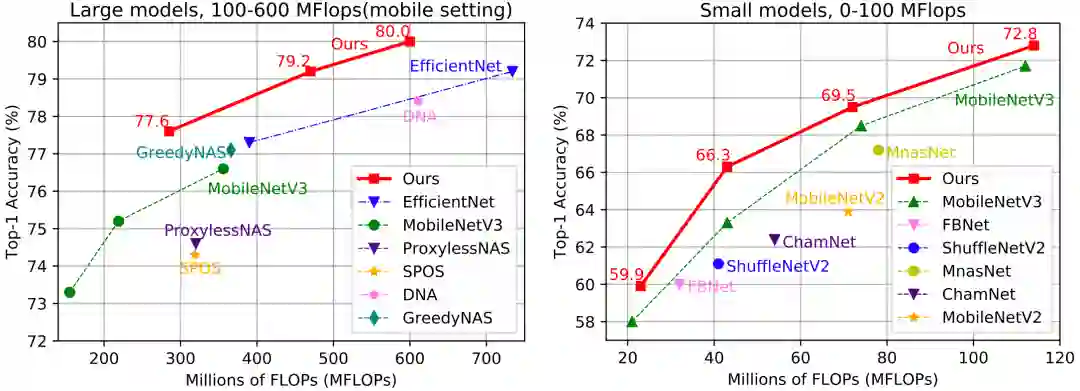 图2:基于优先路径蒸馏的网络结构搜索得到的模型在 ImageNet 上的性能