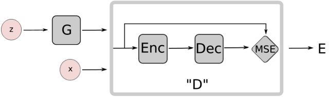 判别器是 loss 为 L1 的自编码器,生成器每生成一幅图,这幅图判别器能够在 loss 很小的情况下自编码,生成器就算胜利。判别器胜利的条件则是①很好地将真实图像自编码,以及②很差地辨识生成的图像。