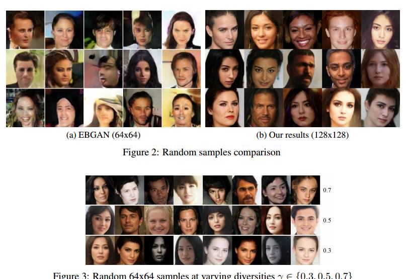 这篇论文的另一个贡献是提出了一个衡量生成样本多样性的超参数 γ:生成样本 loss 的预期与真实样本 loss的预期之比。这个超参数能够均衡 D 和 G,从而稳定训练过程。如果生成器表现太好,就侧重判别器。