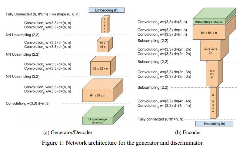 回到我们介绍的 BEGAN,BEGAN 的架构十分简单,几乎所有都是 3×3 卷积,sub-sampling 或者 upsampling,没有 dropout、批量归一化或者随机变分近似。
