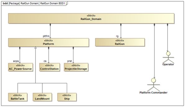 得到需求之后,我们可以开始在SysML中建造轨道炮系统架构。图7中,我们分解轨道炮为电力、轨道和炮弹子系统。