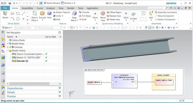 图9 3D CAD 设计, 轨道炮轨梁 (Siemens NX)。插入了SysML参数图,链接到model1,z轴1毫米相当于轨道长度1米