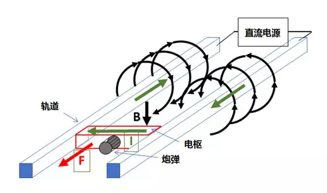 图1展示了电磁轨道炮最基本的形式。直流电脉冲的环路上包括两根导电的轨道和一个跨接在轨道上的可移动电枢。通过轨道的电流产生的磁场B和通过电枢的同一电流I交互产生了一个作用在电枢上的横向力F。如果电枢允许沿着轨道滑动,它就可以带着炮弹,把炮弹从轨道的一端发射向目标。
