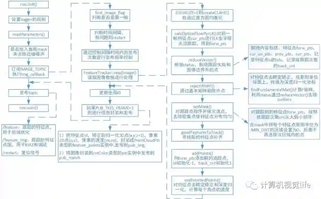 feature_tracker_node.cpp构造了一个ROS节点feature_tracker_node,该节点订阅相机图像话题数据后,提取特征点,然后用KLT光流进行特征点跟踪。feature_tracker节点将跟踪的特征点作为话题进行发布,供后端ROS节点使用。同时feature_tracker_node还会发布标记了特征点的图片,可供Rviz显示以供调试。