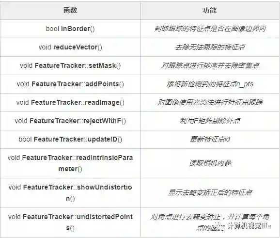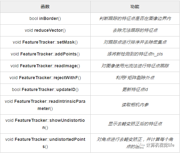 feature_tracker.h和feature_tracker.cpp实现了一个类FeatureTracker,用来完成特征点提取和特征点跟踪等主要功能,该类中主要函数和实现的功能如下