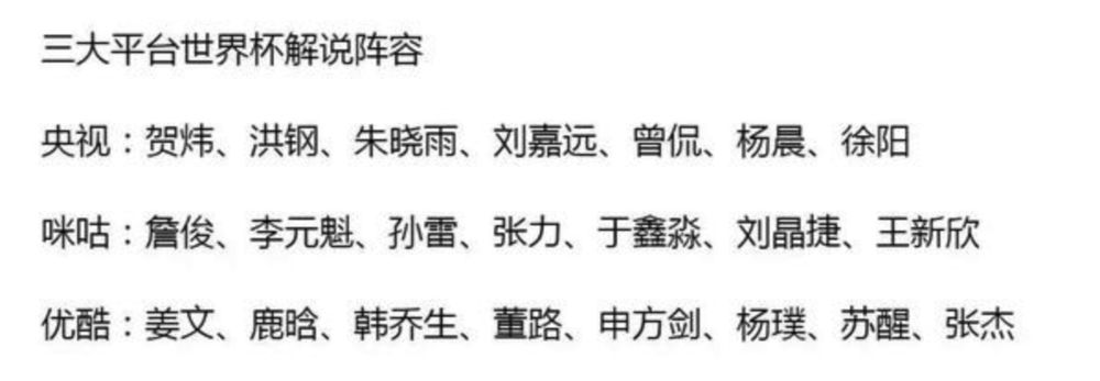 按国内正常渠道,这回世界杯有央视、咪咕、优酷播出,解说嘉宾分别是: