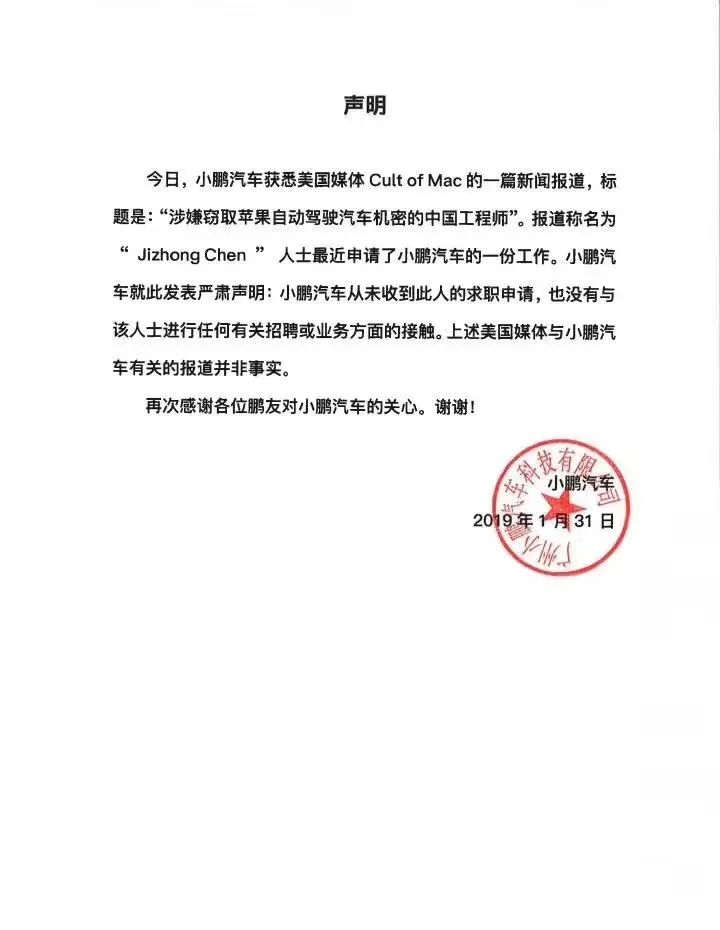 据雷锋网了解:在这次的事件当中,小鹏汽车也牵涉其中。美国媒体Cult of Mac的一篇新闻报道,标题是:“涉嫌窃取苹果自动驾驶汽车机密的中国工程师“。报道称名为“ Ji zhong chen ” 人士最近申请了小鹏汽车的一份工作。