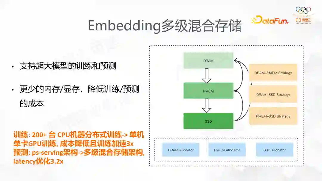 这一功能的出发点同样也是发现EV在特征个数多的时候,内存开销十分大,训练的时候 worker 占用的内存可能达到了几十上百G。我们发现,特征实际上遵循典型的幂律分布。考虑到这个特征点,我们将热点特征放到 CPU 这样更宝贵的资源,而相对长尾低频的特征则放到相对廉价的资源中。如右图,有 DRAM、PMEM、SSD 三种结构,PMEM 是英特尔提供的速度介于 DRAM 和 SSD 之间,但容量很大。我们目前支持 DRAM-PMEM、DRAM-SSD、PMEM-SSD 的混合,也在业务上取得了效果。云上有个业务原来用 200+ 多 CPU 分布式训练,现在使用多级存储后改成了单机 GPU 训练。