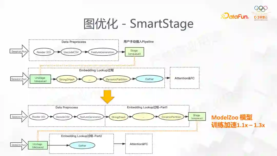 我们看到稀疏模型的训练通常包括样本的读取,EmbeddingLookup,还有MLP 的网络计算。样本的读取和 Embedding 查找往往不是计算密集型的,并不能有效利用计算资源。原生框架提供的 prefetch 接口虽然能一定程度上完成异步操作,但是我们在 EmbeddingLookup 过程中设计部分复杂的子图,这些不能通过 TensorFlow 的 prefetch 实现流水线。TensorFlow 提供的流水线功能,实际使用中需要用户显示的指定 stage 边界,一方面会提高使用难度,另一方面由于 stage 的精度不够,无法精确到 op 级别。对于 High Level 的 API 用户无法手动插入,会导致很多步伐并行化。下图是 SmartStage 的具体操作,它会将 Op 自动的归类到不同的 Stage,使得并发的流水线能得到性能的提升。我们在 ModelZoo 里模型的测试效果最大加速比能达到 1.1-1.3。