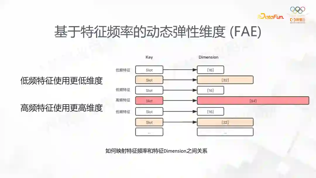 通常情况下同一个特征对应的 EmbeddingVariable 会被设置为同一个维度,如果 EmbeddingVariable 被设置一个较高的维度,低频的特征内容容易导致过拟合,并且会消耗大量的内存。相反的如果维度设置的过低,高频的特征内容则有可能因为表达的能力不足而影响模型的效果。FAE 的功能则提供了对于同一个特征里,根据不同特征冷热来配置不同的维度。这样让模型自动进行训练时第一个是模型的效果能得到保证,第二个也能解决训练对资源的使用。这是对于 FAE 功能的出发点的介绍。这个功能的使用目前是让用户传入一个维度和统计的算法,FAE 自动根据实现的算法来产生不同的 EmbeddingVariable;后面 DeepRec 计划在系统内部自适应的发现去分配特征的维度,从而提高用户的易用性。