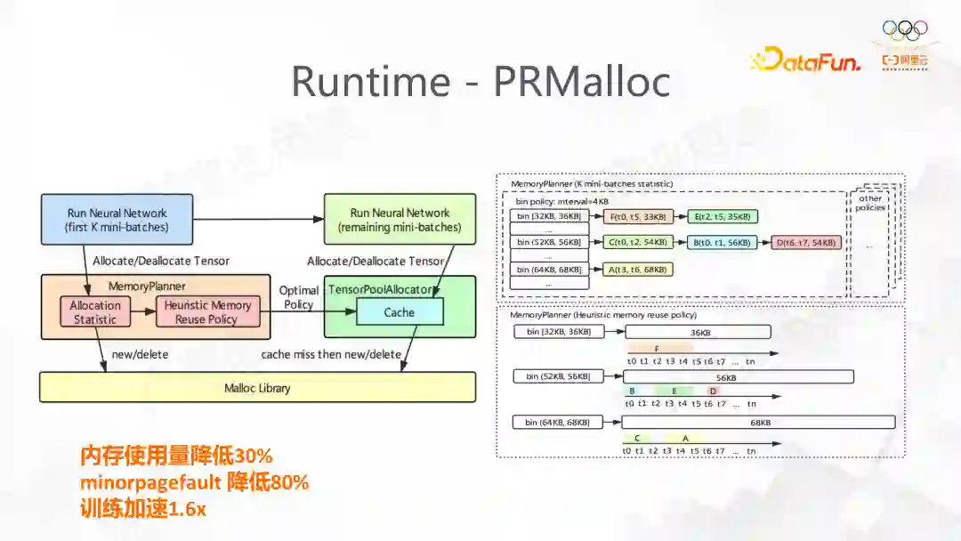 。它提高了内存使用率和系统的性能。在图中可以看到主要的一块是 MemoryPlanner,它的作用是在模型训练的前 k 轮的 minibatch 先统计当前训练的特点,每次需要分配多少 Tensor,将这些行为记录通过 bin 的 buffer 记录下来,并且做相应的优化。在k步后,我们将其应用,从而极大减少上述的问题。我们在 DeepRec 的使用中发现,这能大大减少 minorpagefault 的出现,减少了内存的使用,训练速度也得到了 1.6 倍的加速。