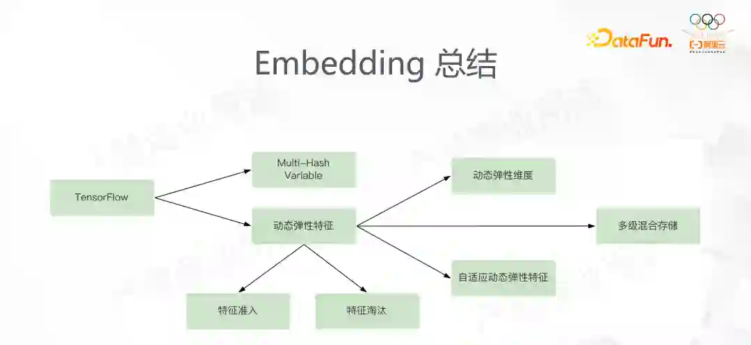 以上是对 Embedding 所有功能的介绍。我们做这些功能的动机是由于TensorFlow 的几个问题(主要是特征冲突),我们解决的方案是动态弹性特征和 Multi-Hash 特征,针对动态弹性特征内存开销较大的问题,我们又开发了特征准入和特征淘汰的功能;针对特征频次,我们开发了 3 组功能:动态弹性维度和自适应动态弹性特征是从维度的方向解决的问题,多级混合存储则是从软硬件的方向解决的问题。