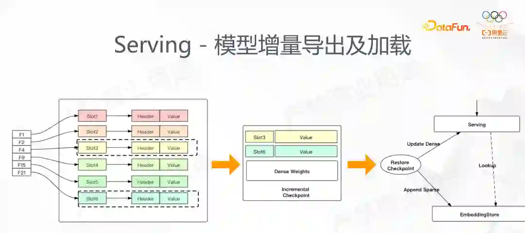 一开始在介绍 Embedding 的时候其中一个重要的点是低效的 IO,如果将前面提到动态弹性功能应用后,我们天然能做增量的导出。只要在图中加入曾经访问的稀疏 ID,那么在增量导出的时候就能准确的导出这部分我们需要的 ID。我们做这个功能有两个出发点:首先,模型训练时我们原有的方法,在每个 step 导出全量的模型导出,在程序中断 restore 时候也是 restore checkpoint,最差的时候可能损失两个 checkpoint 区间所有的结果,有了增量导出,我们对于 dense 部分会全量导出,sparse 部分是增量导出,这在实际场景 10 分钟的增量导出能很大程度节约 restore带来的损失;另外,增量导出的场景是在线 serving,如果每次都全量加载,那么对于稀疏场景,模型十分大,每次加载都需要耗费很长时间,如果要做在线学习会很困难,所以增量导出也会用到 ODL 场景。