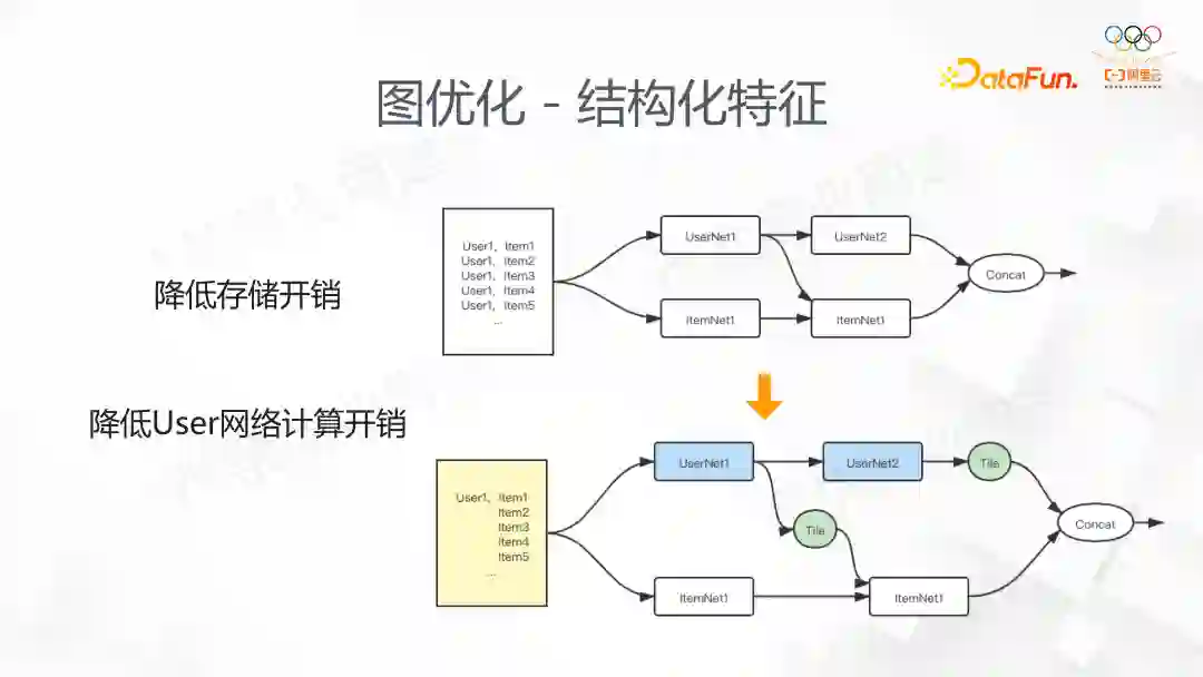 这是从业务启发的一个功能。我们发现在搜索场景下,不管是训练还是推理,样本往往是 1 个 user 对应多个 item,多个 label 的特点。原来的处理方式会视为多个样本,这样 user 的存储是冗余的,我们为了节省这部分开销,自定义了存储格式来做这部分优化。如果这些样本在一个 minibatch 中是同一个 user,部分 user 网络和 item 网络会分别计算,最后在做相应的逻辑计算,这样能节省计算开销。所以我们分别从存储和计算端做了结构化的优化。
