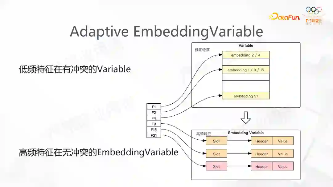 将静态的 Variable 转化为动态的类似 HashTable 的存储,每来一个 key,新创建一个 Embedding,这样就天然地解决了特征冲突的问题。