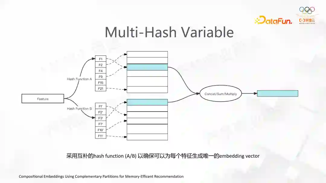 这个功能是为了解决特征冲突的问题。我们原来是通过一个 Hash+Mod的方式解决特征冲突,现在用两个或多个 Hash+Mod 去得到 Embedding,并且随后对得到的 Embedding 做 Reduction,这样的好处是能用更少的内存来解决特征冲突的问题。