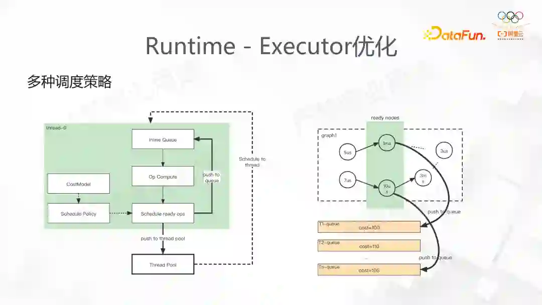 TensorFlow 原生的 Executor 的实现十分简单,首先对 DAG 做拓扑排序,随后将 Node 插入到执行队列中,通过 Task 利用 Executor 调度。这样的实现没有结合业务考虑,ThreadPool 默认使用了Eigen线程池,若线程负载不均匀,会发生大量的线程间抢占 Steal,带来极大开销。我们在 DeepRec 中定义调度更均匀,同时定义了关键路径使得在调度的时候有一定的优先级顺序,来执行 Op。最终 DeepRec 也提供了多种包括基于 Task,SimpleGraph 的调度策略。