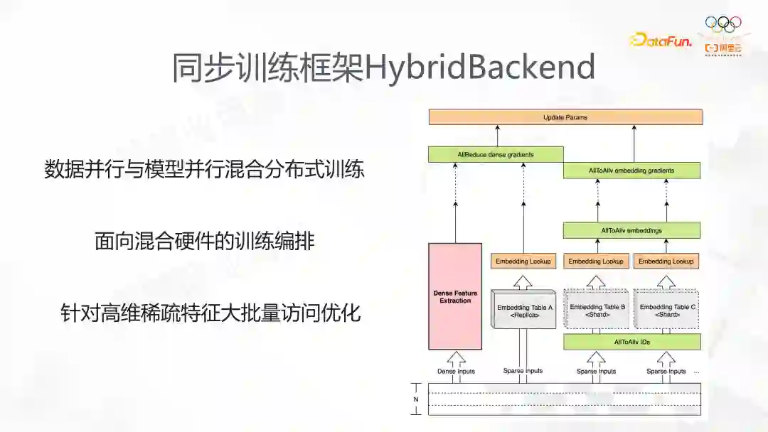 这是我们为同步训练开发的方案,它支持数据并行和模型并行混合分布式训练。数据读取通过数据并行来完成,模型并行能支持大参数量训练,最后使用数据并行做稠密计算。我们针对不同 EmbeddingLookup 的特征,做了多路 Lookup 合并的优化,分组优化,还利用了 GPU Direct RDMA 的优点,基于网络拓扑的感知,设计整个同步的框架。