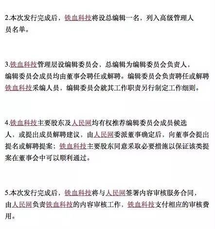 根据公告显示,本次发行完成后,铁血科技将设总编辑一名,列入高级管理人员名单。同时将设编辑委员会,总编辑为编辑委员会负责人。本次发行完成后,铁血科技将于人民网签署内容审核服务合同,由人民网负责铁血科技的内容审核工作,铁血科技将支付相应的审稿费用。