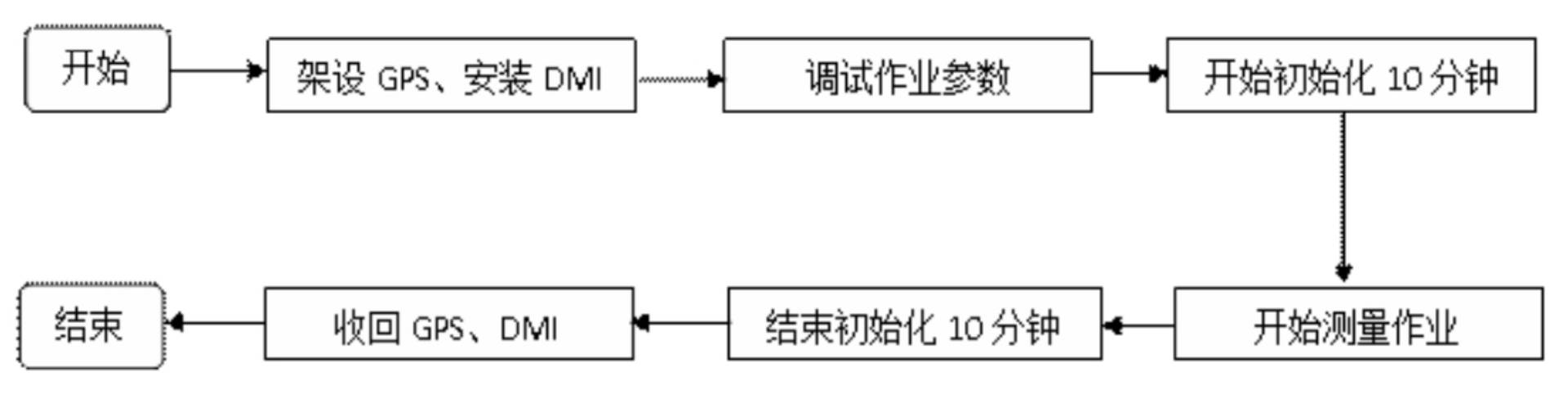 参数设置完成后,启动流动站 GPS、PC104、IMU,开始静态初始化工作,保持车辆 10 min 以上静止不动,之后再进行测量作业。作业过程中移动测量车行驶车速以所在车道允许的最低行驶速度为准,该次车速为 60 km/h,并且避免以超车为目的的变道、提速。作业结束后,先结束激光扫描仪,再结束相机曝光,保持车身静止10 min,做结束初始化,之后依次关闭 IMU、流动站 GPS、基站 GPS,结束工作,见图 2。