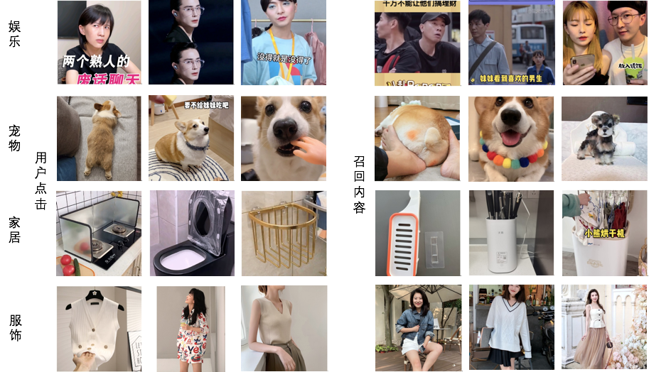 本节我们以一个用户在内容场景和电商场景的点击行为与CMDM在各个兴趣下的召回内容为例, 进行简单的 CASE 展示。如下图所示,左边是用户在在内容场景和电商场景的点击行为,其中内容场景的行为主要覆盖了娱乐、宠物和家居三个领域的内容,而电商场景的绝大部分行为都与服饰相关。最终CMDM的召回内容涵盖了娱乐、宠物、家居和服饰领域的内容,在保留用户在内容场景点击核心内容的基础上兼顾了商品域兴趣向内容域的迁移。我们的上线实验结果也表明,加入了用户的商品点击行为序列的CMDM与只使用内容行为序列的base模型相比,效率提升非常明显。