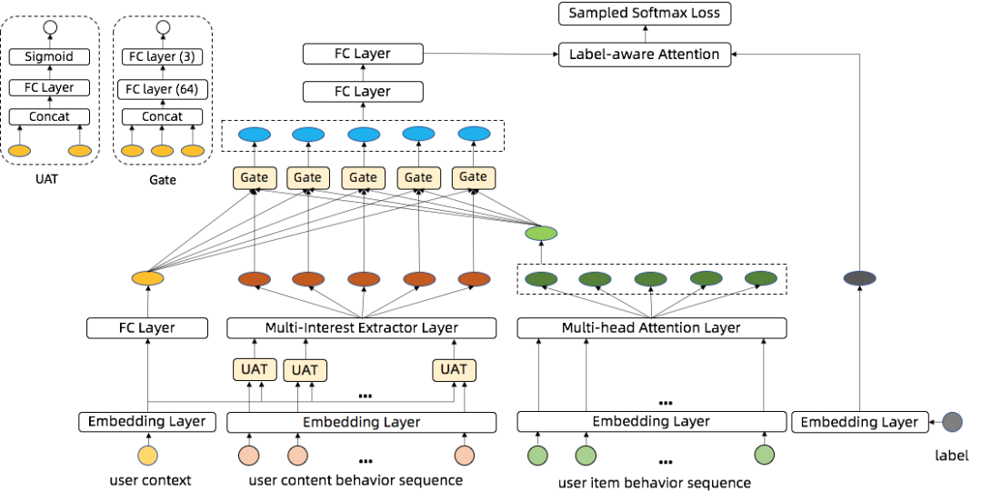 我们对于内容行为序列和商品行为序列采用了不同的建模方式。对于内容行为序列,我们采用了MIND提出的动态路由(Dynamic Routing)算法来建模用户的多峰兴趣分布,因为与商品消费场景相似,用户在内容消费场景的浏览兴趣通常也会横跨多个类目,同时多兴趣召回对于提升内容场景的多样性等生态指标至关重要。与MIND不同的是,我们设计了UAT(user attention network)注意力机制,在内容进入动态路由进行聚类之前使用用户基础画像特征对内容行为序列进行attention,使得聚类出的多兴趣与用户更加匹配。对于商品行为序列,我们直接使用Transformer中的multi-head attention机制提取序列特征。我们对内容行为序列和商品行为序列区别对待的原因是内容行为序列是内容场景中的核心行为,刻画了用户的真实兴趣。而商品行为序列更多的是充当辅助内容序列学习的角色,因此需要一个能够完整提取用户商品域兴趣的建模方式。这里我们也尝试过使用动态路由方法对商品行为序列建模,发现效果不如multi-head attention机制。
