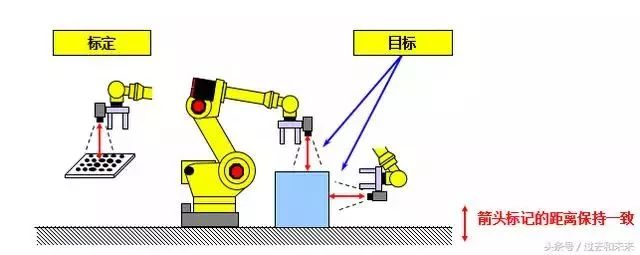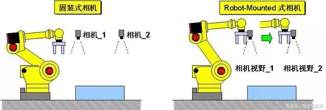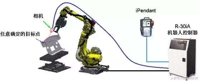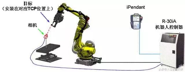 Robot-mounted 式照相机的标定可以用于如下图所示任意位置和方向下的iRVision程序。2D状态下的移动补偿与照相机实际位置相关联。照相机的标定可以在任意位置下进行。减少示教工作量。