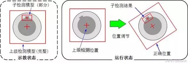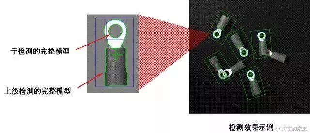 依据子检测的结果,对应目标表面明显特征(如孔,键槽)调整父检测的定位位置,获得更精确的偏移和旋转数据。对不能以整个示教模型进行方向性定位的应用较有效。对一个上级检测,可以使用多个下级子检测来分析目标的多种局部特性。