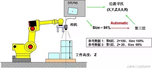 视觉堆垛程序通过相机视野内目标比例的变化来估算目标的高度并引导机器人的运动补偿目标的偏移,不但包括X轴,Y轴和X-Y平面旋转度R,也同时包括Z轴。