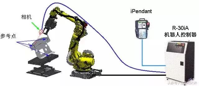 通过视觉程序调整机器人TP程序以对应实际的工件位置,只需在机器人手爪端添加一台相机即可执行此功能。固定工件上的3处任意的参考点的位置数据将被自动检测并计算出补偿数据。