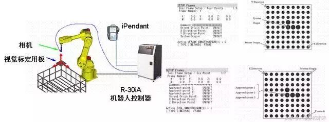 坐标系设置的另一种功能:通过视觉设置一个与视觉标定板对等的用户坐标系。通过装置在机器人手爪末端的相机,用户坐标系UF设置在视觉标定板的原点位置(四点法),或当视觉标定板装置在机器人手爪末端,则工具坐标系UT设置在视觉标定板的原点位置(六点法)。