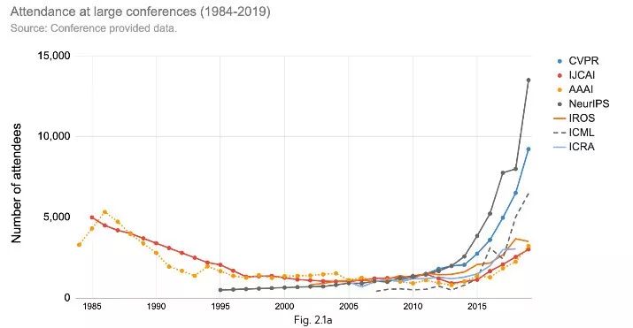 参会人数太多也是阻碍线下会议的一个因素。随着人工智能的火热,AAAI、NeurIPS、CVPR 等顶级学术会议的影响力也愈来越大,每年接收论文、参会人数的数量连创新高。