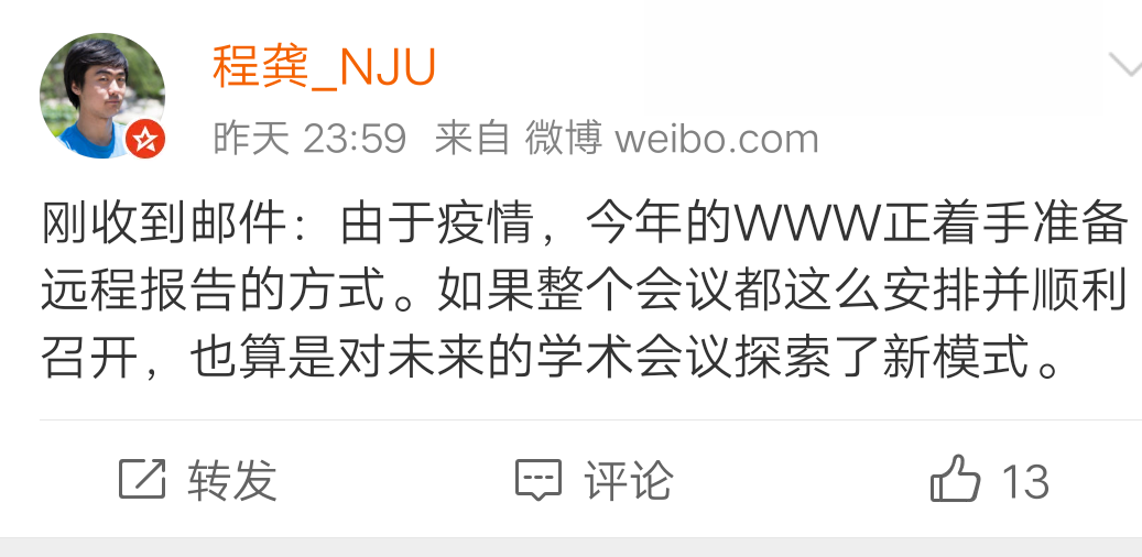 在前几天,南京大学计算机系的教师,程龚发微博表示由于疫情,今年在台北召开的WWW会议将着手准备远程报告的方式。这是继AAAI 2020 之后,又一个因疫情原因使用远程报告的国际顶级AI学术会议。