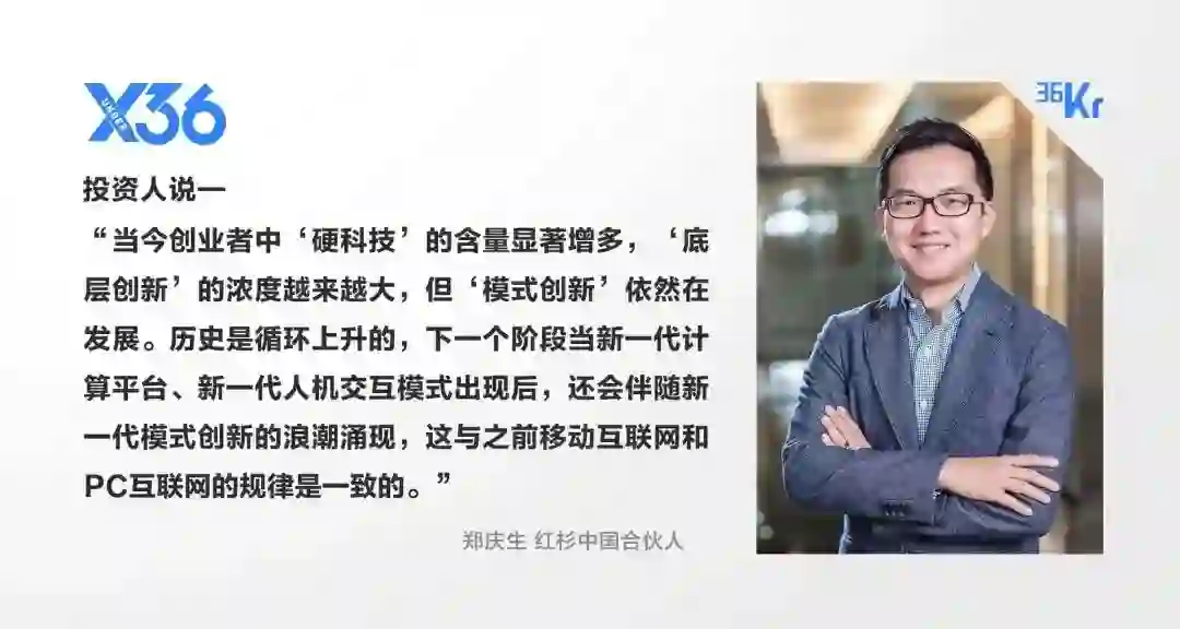 当今创业者中‘硬科技’的含量显著增多,‘底层创新’的浓度越来越大,但‘模式创新’依然在发展。历史是循环上升的,下一个阶段当新一代计算平台、新一代人机交互模式出现后,还会伴随新一代模式创新的浪潮涌现,这与之前移动互联网和PC互联网的规律是一致的。