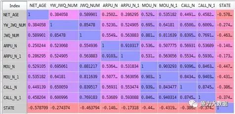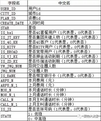 *字段说明:NET_AGE(网龄)、YM_JWQ_NUM(异网交往圈人数)、JWQ_NUM(交往圈人数)、APPU_N(本月费用)、APPU_N_1(上月费用)、MOU_N(本月通话时长)、MOU_N_1(上月通话时长)、CALL_N(本月主叫通话时长)、CALL_N_1(上月主叫通话时长)、STATE(1:低稳;0:中高稳)