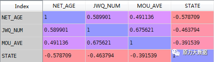 *字段说明:NET_AGE(网龄)、JWQ_NUM(交往圈人数)、MOU_AVE(本月和上月平均通话时长)、STATE(1:低稳;0:中高稳)