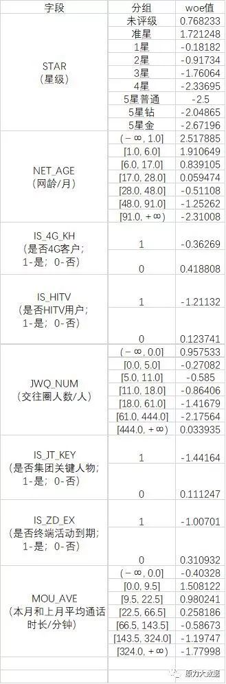 如表中网龄NET_AGE字段,网龄小于28个月的分组WOE值都为正,表明网龄小于28个月的客户更有可能被判定为流失客户,网龄越小,WOE数值越大,表明可能性也越大。