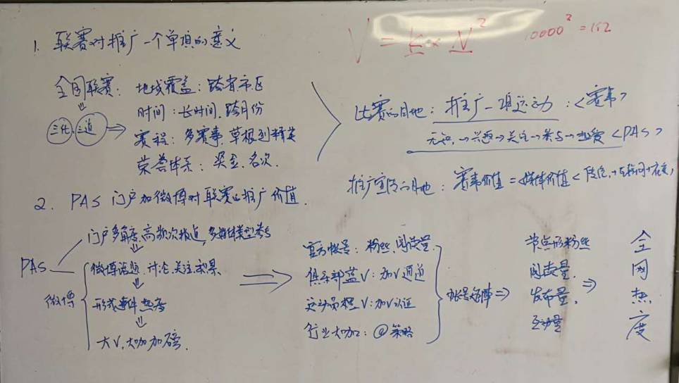 目前,新浪体育自主赛事IP的估值,可用计算公式:V = K x N² 算得。这个公式出自梅特卡夫定律 ,是互联网领域的三大定律之一,可描述互联网公司 IP 赛事的价值。其中,V代表互联网公司 IP 赛事的价值,K 为价值系数,N 为用户数量,也就是节点型粉丝(话题参与度稿,积极发表原创评论,同时他也是信息消费者),也即上文提到的蓝V、橙V等。