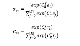 然后将文本中的所有实体和关系分别根据前面算出的权重进行加权平均,从而得到文本中所有实体和关系的向量 e, r。
