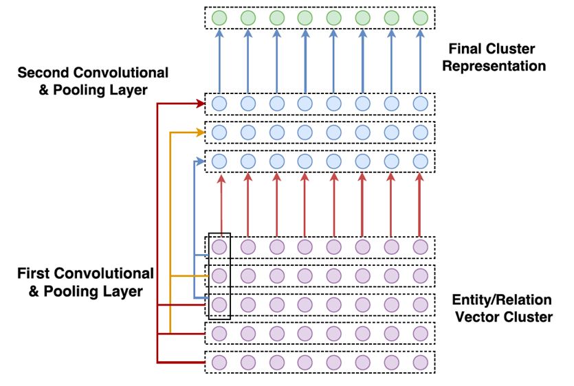 文本中实体和关系的数目很大,为每一个实体和关系分别计算权重开销不菲。为了减少注意力空间,本文利用k-means算法对实体和关系向量进行聚类,并引入了基于卷积的模型来学习知识图谱实体和关系集的表示。